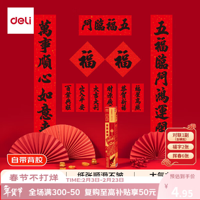 自营得力新春背胶2026年对联套装大门过年春联福字红包套装