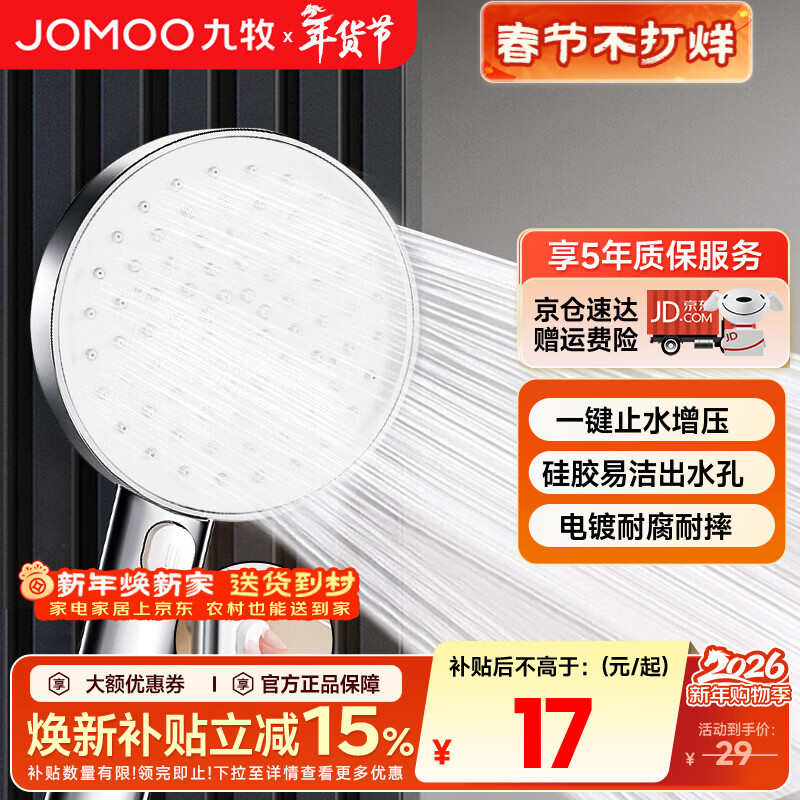 旗舰店九牧(JOMOO)淋浴花洒喷头增压手持花洒莲蓬头家用加压洗澡沐浴淋雨软管套装 增压花洒喷头【一键止水】