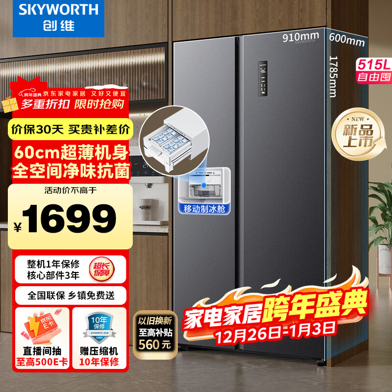 自营创维515升对开门大容量家用冰箱双开门电冰箱 超薄嵌入 风冷无霜一级能效变频节能国补 BCD-515W2B1