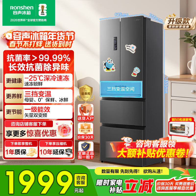 旗舰店容声325升法式多门四开门双循环家用电冰箱一级能效变频风冷无霜超薄小户型母婴空间以旧换新国家补贴 风冷无霜节能冰箱 BCD-325WD18MP灰