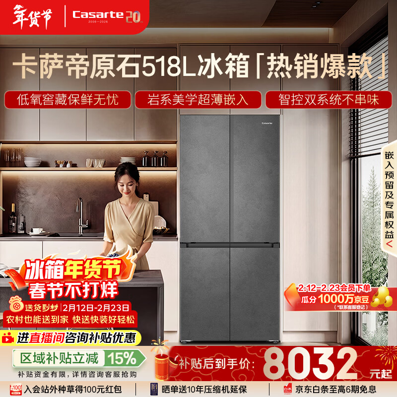 自营卡萨帝(Casarte)原石518L十字门冰箱MRA PLUS低氧窖藏保鲜594MM超薄零嵌一级能效BCD-518WGCTDM4GUU1 517同款