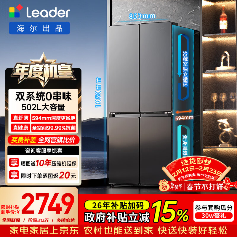 自营海尔冰箱出品统帅(Leader)懒人510系列502L十字门冰箱家用母婴超薄双系统大容量LTD-510WDS9U1国家补贴