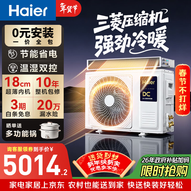 自营海尔中央空调云舒风管机一拖一3匹一级能效 纯铜管 云璟pro升级款 KFRd-72NW/72ECD81国家补贴