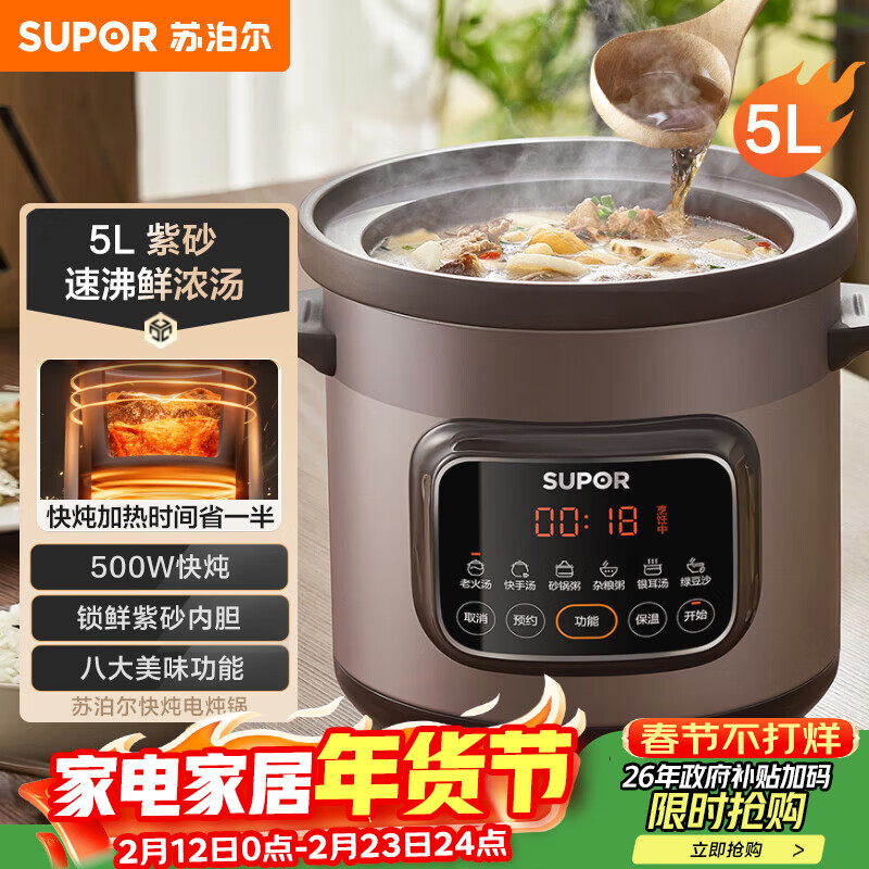 自营苏泊尔(SUPOR)快炖电炖锅 电砂锅 电炖盅 炖汤盅煲汤锅 紫砂锅 燕窝炖盅 煮粥神器 熬粥锅 DG50YC872多功能锅