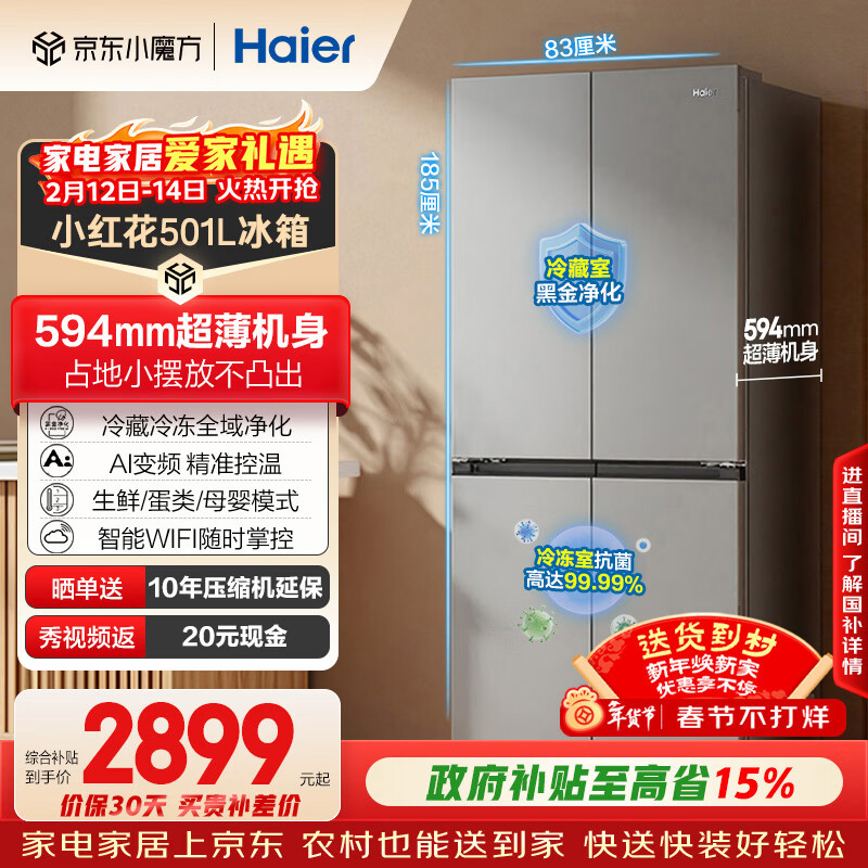 自营海尔(Haier)「小红花系列」501L十字门冰箱超薄冷藏冷冻双净化一级变频风冷无霜BCD-501WGHTDEDH9U1