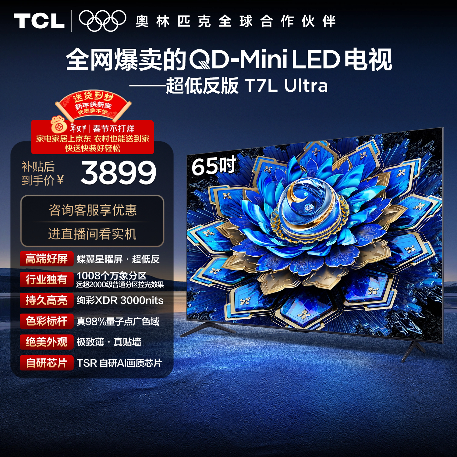 自营TCL电视 65T7L Ultra 65英寸 QD-Mini LED 蝶翼星曜屏 万象分区 绚彩XDR 超薄 国家补贴 T7L 护眼