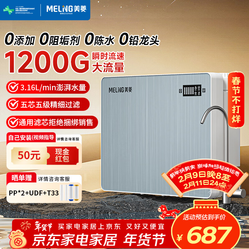 自营美菱(MeiLing)净水器家用净饮机RO反渗净水器瞬时1200G大流速直饮机通用滤芯厨下式自来水过滤器ML-5R100X608