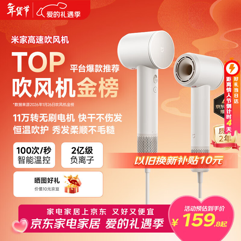 自营米家高速吹风机速干小米吹风机智能温控恒温静音大功率电吹风负离子家用吹风筒女友情人节礼物奶白色