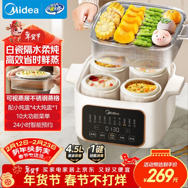 自营美的(Midea)电炖盅电炖锅蒸锅隔水炖家用全自动煲汤炖汤锅陶瓷燕窝炖盅4.5L蒸炖一体多功能锅3-4人MD-DZE2552