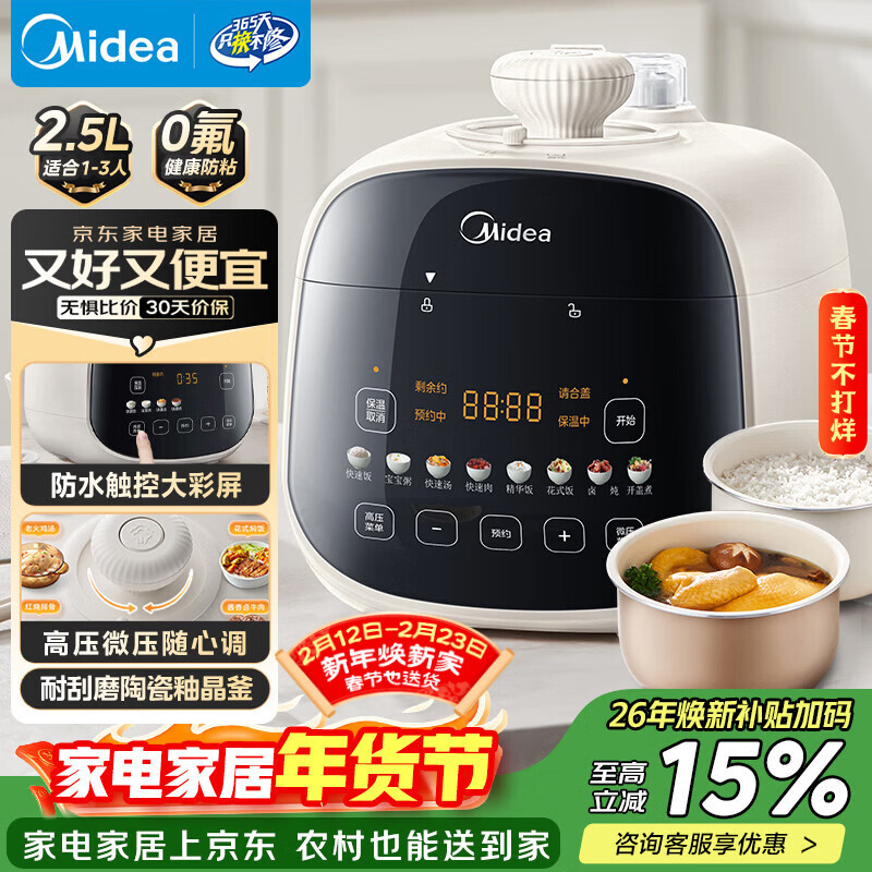 自营美的(Midea)触控电压力锅高压2.5L小型2-3人电饭煲 全自动智能预约开盖火锅宝宝粥煲汤MY-E3915电压锅