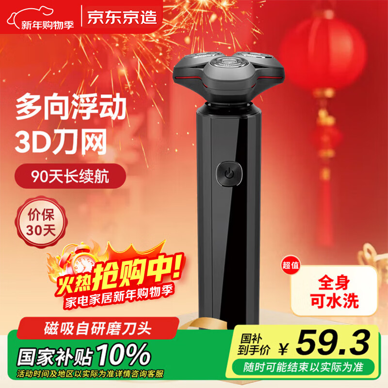 自营京东京造三头剃须刀便携款 长续航电动刮胡刀电动胡须刀电动剃须刀旋转式剃须刀可水洗 生日礼物男
