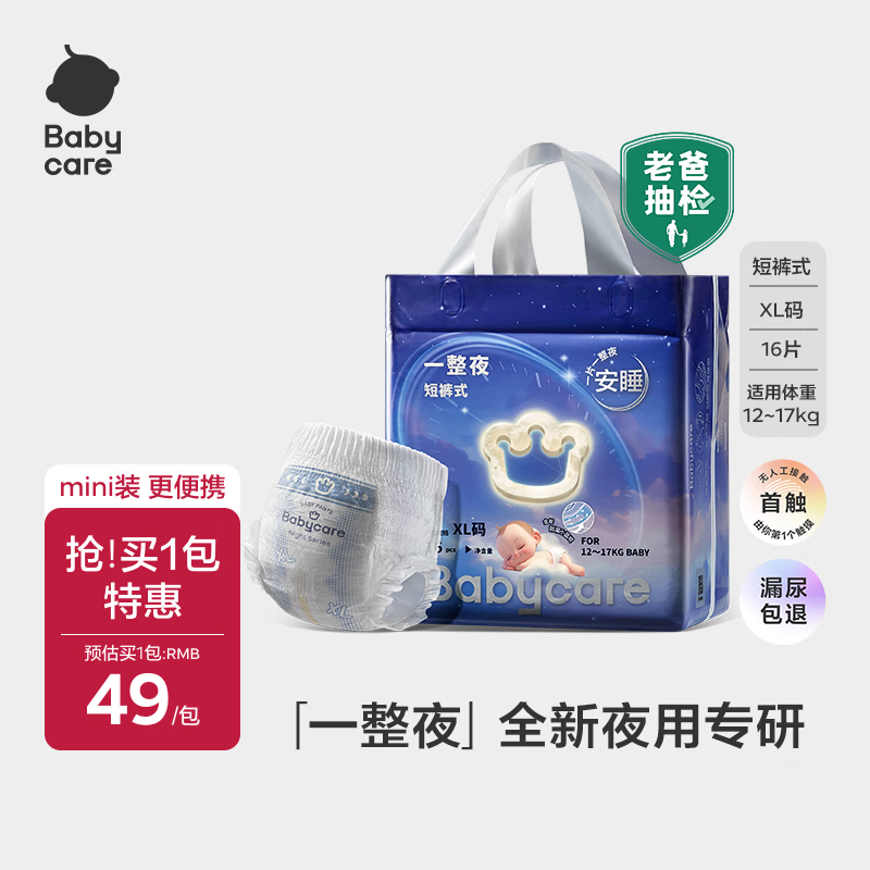 自营babycare一整夜拉拉裤miniXL16片(12-17kg)大吸量透气夜用安睡婴儿尿不湿