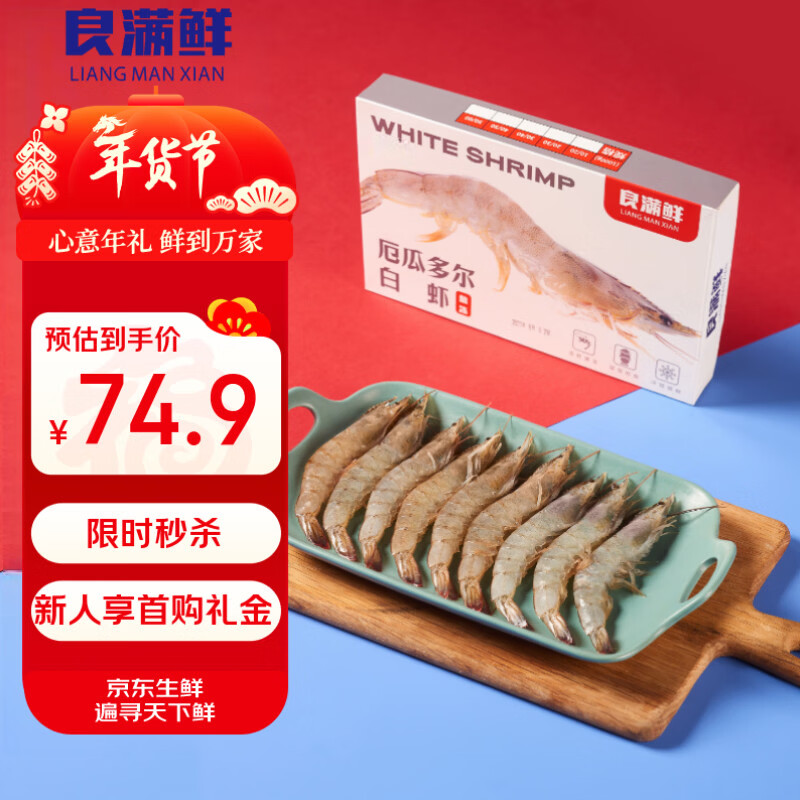 自营良满鲜 厄瓜多尔白虾 无冰净重3斤 75-90只/盒盐冻大虾海鲜年货礼盒送礼