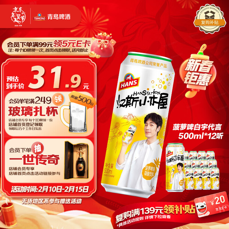 自营青岛啤酒(TsingTao)汉斯小木屋菠萝啤整箱果啤 碳酸饮料500ml*12听 年货送礼