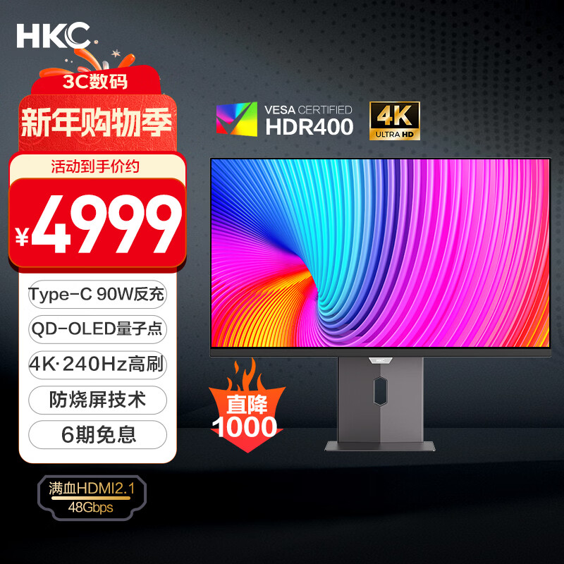 自营HKC 31.5英寸QD-OLED量子点4K 240Hz原生10bit电竞HDR400硬件低蓝光Type-C90W升降旋转显示器GS32UK