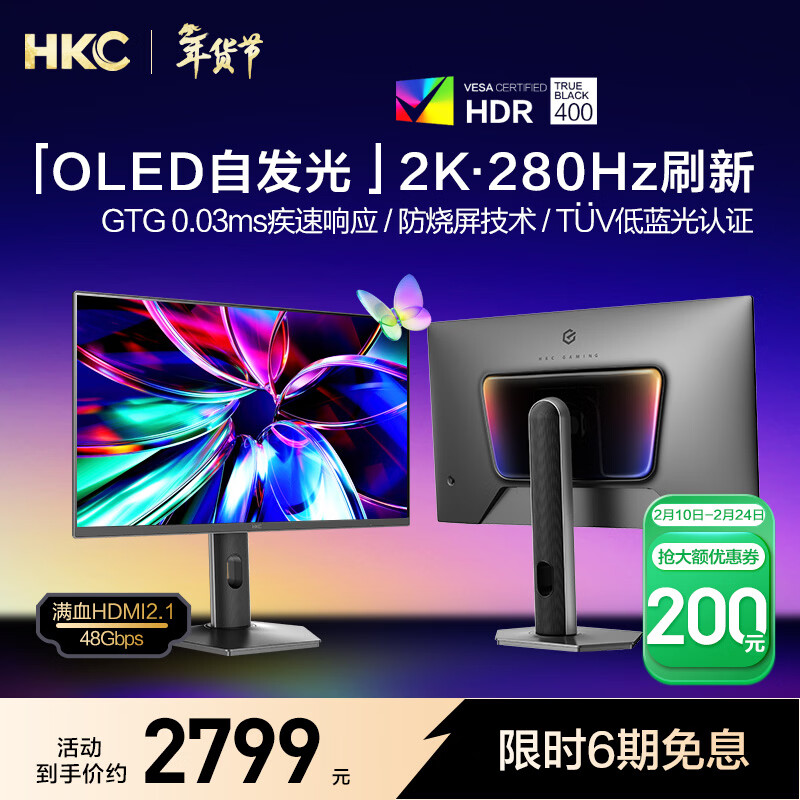 自营HKC 26.5英寸QD-OLED量子点2K超清280Hz原生10bit硬件低蓝光HDR400电竞旋转升降27英寸显示器GS27QTS