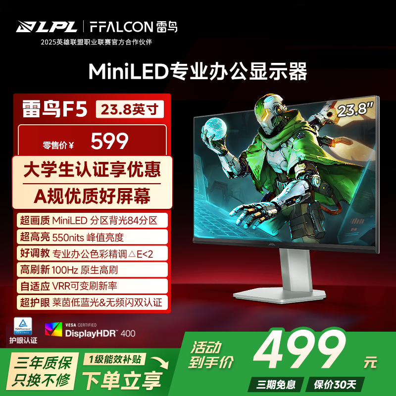 旗舰店雷鸟F5 23.8英寸100Hz 84分区MiniLED商用办公显示器 HDR400 莱茵护眼 低蓝光无频闪 设计电脑显示屏 23.8英寸/100Hz/直面屏
