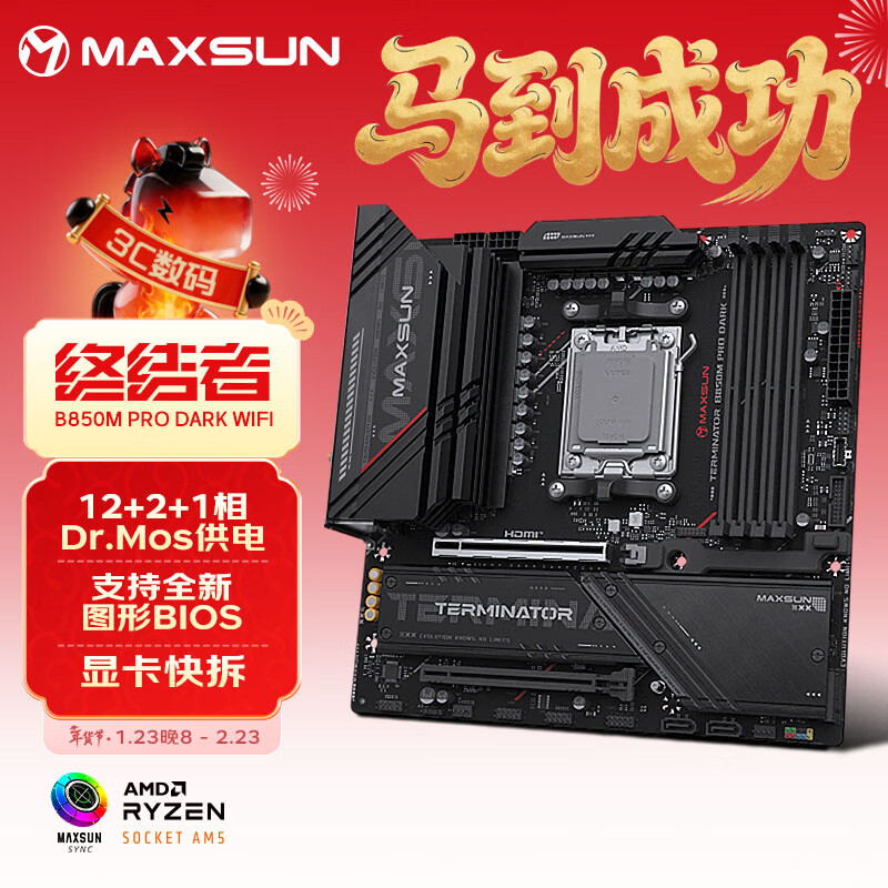 自营铭瑄(MAXSUN)终结者 B850M PRO DARK WIFI主板 DDR5 CPU AMD 9850X3D/9700X/9600X/7800X3D(AMD B850/AM5接口)