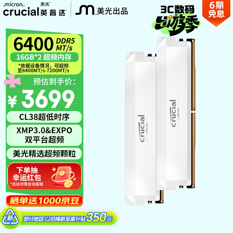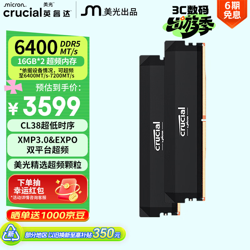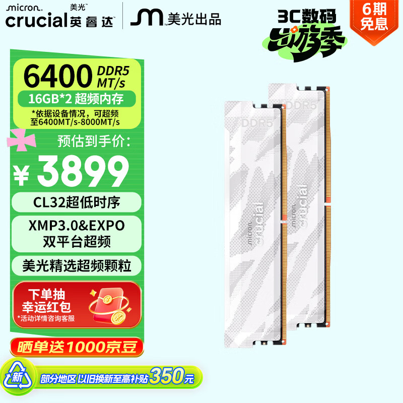 自营英睿达(crucial)32GB(16GB×2)DDR5 6400 台式机内存条 Pro系列 美光(原镁光)原厂颗粒 CL38超频 AI电脑配件