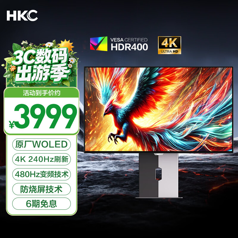 自营HKC 31.5英寸OLED屏4K 240Hz双模480Hz原生10bit硬件低蓝光Type-C90W旋转升降HDR400电竞显示器OG32UK
