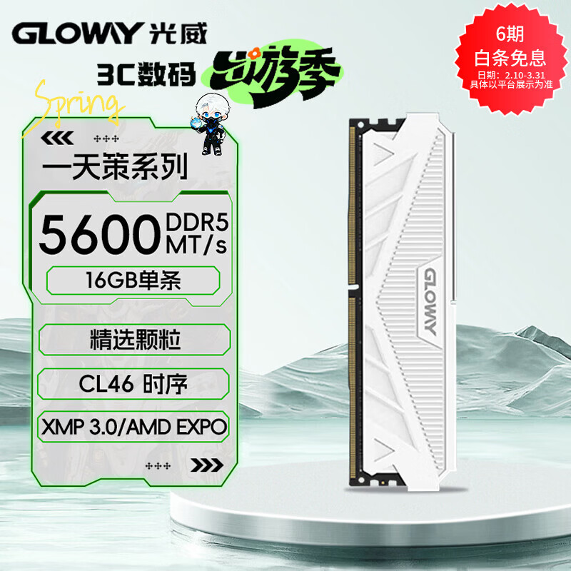 自营光威(Gloway)16GB DDR5 5600 台式机内存条 天策 马甲条 精选颗粒 CL46 皓月白