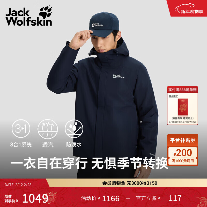 旗舰店jackWolfskin狼爪25秋冬新款JOYFUL男款户外抓绒内胆三合一冲锋衣外套A65466 宝蓝色/1010 2XL