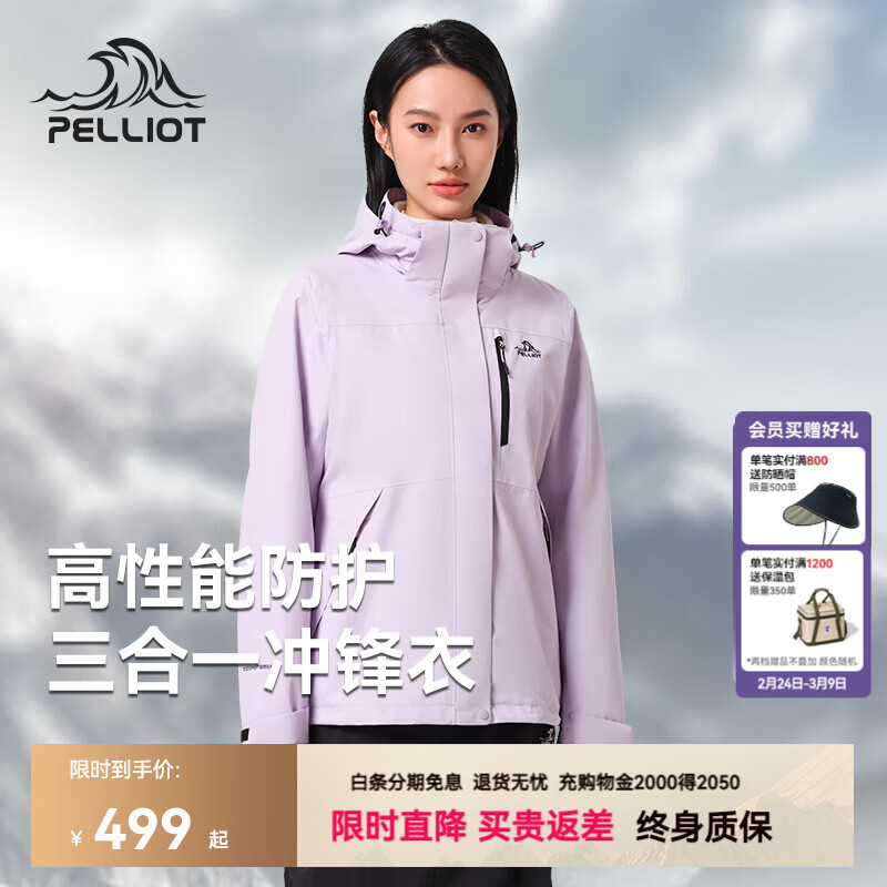 旗舰店伯希和(Pelliot)【山野2.0】伯希和户外冲锋衣女新款三合一外套男防风防水登山服 【女】丁香紫 两件套 可拆卸抓绒内胆 S 女款90-100斤/男款105-115斤