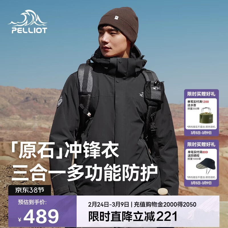 自营伯希和(Pelliot)[成毅同款]原石冲锋衣三合一男女秋冬户外保暖外套114301029黑S
