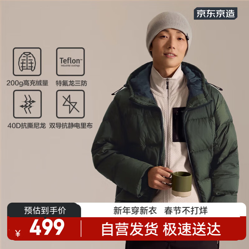 自营京东京造户外羽绒服连帽三防面包短款羽绒服男士外套 踪野绿 XL