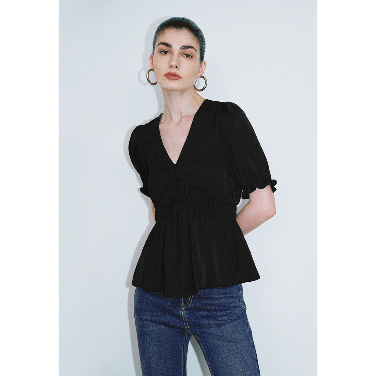 UR夏季女装法式气质泡泡袖捏褶V领罩衫衬衫UWG240100
