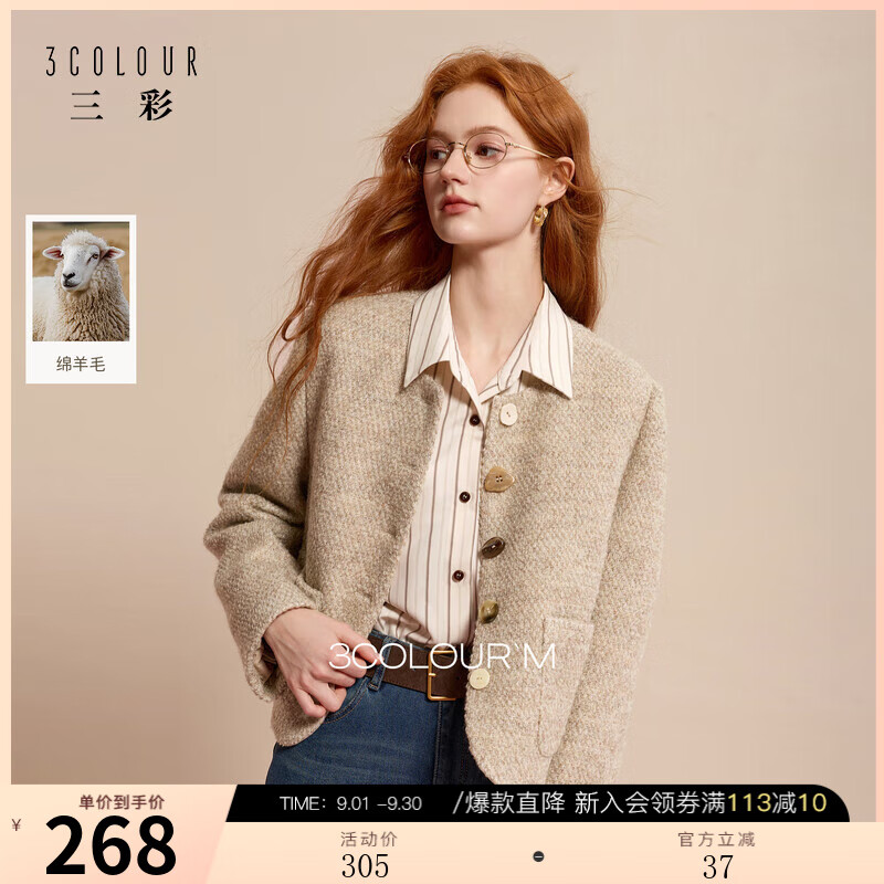 三彩【绵羊毛】2025冬季新款香风毛呢外套圈圈呢圆领短款大衣M 杏色预售[付款25天内]发 L 165/88A