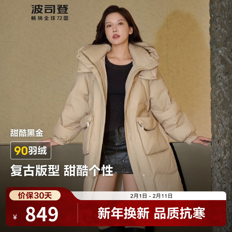旗舰店波司登(BOSIDENG)【断码清仓】黑金系列羽绒服女款中长款90绒商场同款宽松外套 电光卡其7594 XS 155/80A