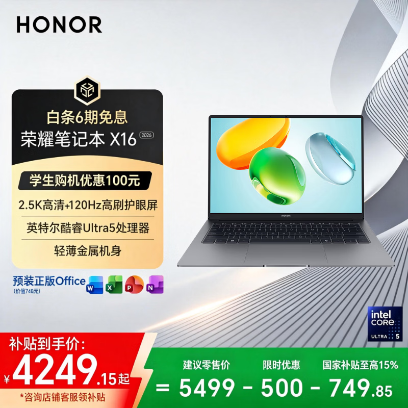 自营荣耀笔记本X16 2026【限时补贴】酷睿Ultra5 24G 1T 120Hz 2.5K高刷护眼屏 16吋轻薄笔记本电脑 灰