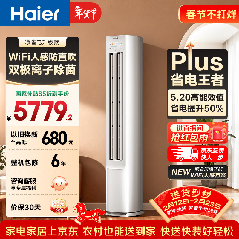 自营海尔空调净省电Plus 大3匹新一级能效变频客厅立式柜机 双排铜管 以旧换新国家补贴 KFR-72LW/E1-1Plus