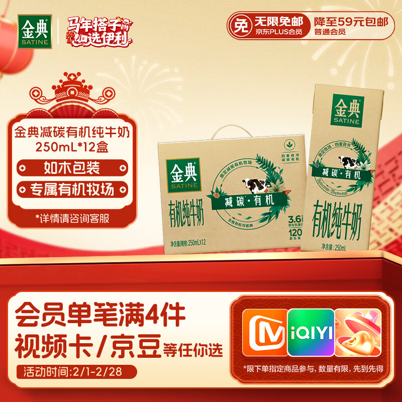 自营伊利金典减碳有机纯牛奶整箱 250ml*12盒 3.6g乳蛋白 年货礼盒装