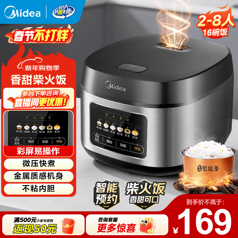 旗舰店美的(Midea)电饭煲家用3-4-5-8个人多功能智能电饭锅 4L大容量 柴火饭煮粥煲汤不粘内胆蛋糕微压 【家庭优选】MB-RE429- 4L 4-5L