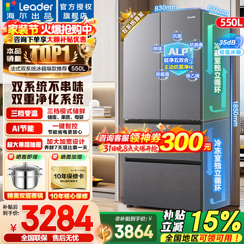 百亿补贴海尔冰箱出品统帅575双系统冰箱【旗舰热销】法式多门双循环新一级能效风冷无霜leader电冰箱 双系统双循环+ALP超净系统+三档变温