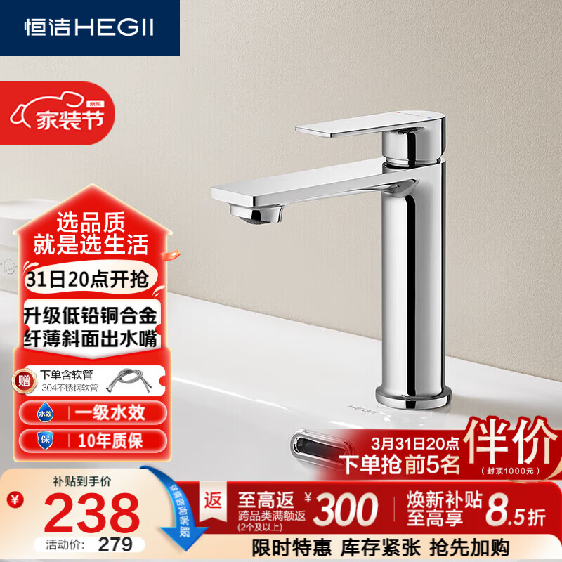 自营恒洁(HEGII)面盆水龙头 精铜主体冷热浴室洗脸盆卫生间水龙头DML900B-111