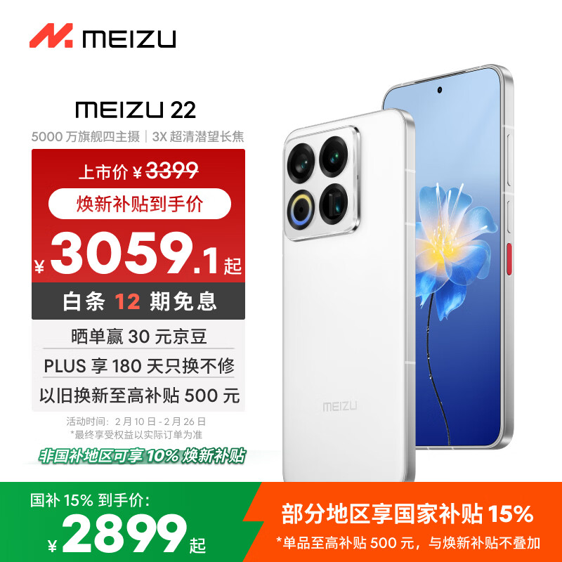自营魅族(meizu)22 12GB+512GB 魅族白 5000万旗舰四主摄 3X超清潜望长焦 第四代骁龙8s 5G拍照手机