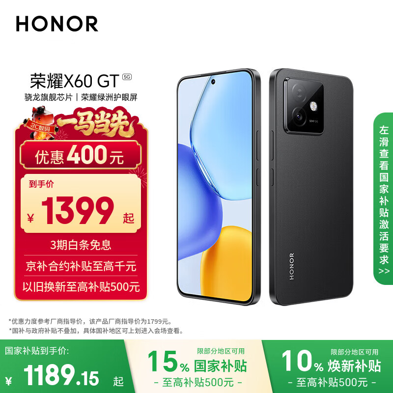 自营荣耀X60 GT 12+256 幻夜黑 骁龙旗舰芯片 6300mAh青海湖电池 荣耀绿洲护眼屏 国家补贴 AI 5G手机