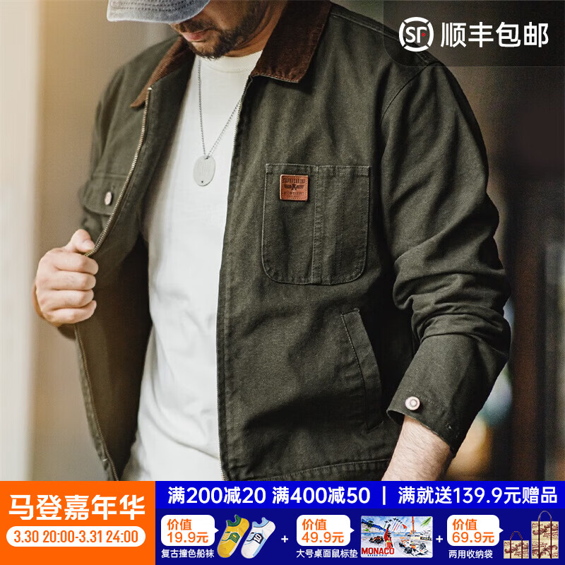 百亿补贴马登工装美式复古改制版底特律夹克男秋薄款帆布翻领猎装上衣男士外套 军绿色 M