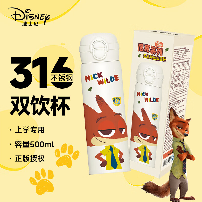 自营迪士尼(Disney)尼克双饮保温杯疯狂动物城316不锈钢带吸管上学男孩女神礼物500ml