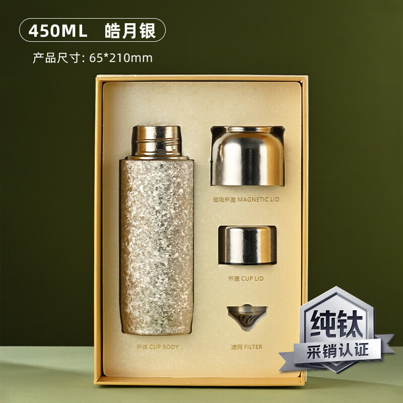 旗舰店花卜丸纯钛杯保温杯男女焖茶水分离杯子大容量便携伴手节日礼物品泡茶杯 皓月银460ML (内外纯钛+纯钛杯盖+纯钛茶隔)
