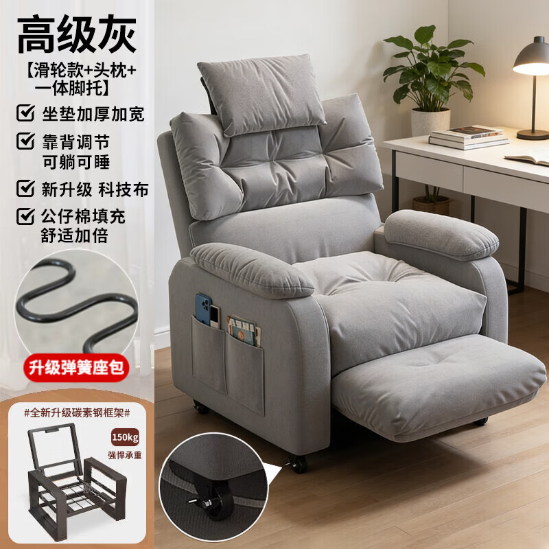 百亿补贴奕华盛电竞椅沙发家用办公游戏可坐靠躺睡觉网吧电脑椅单人懒人沙发 高级灰+头枕+脚踏【钢架滑轮款】