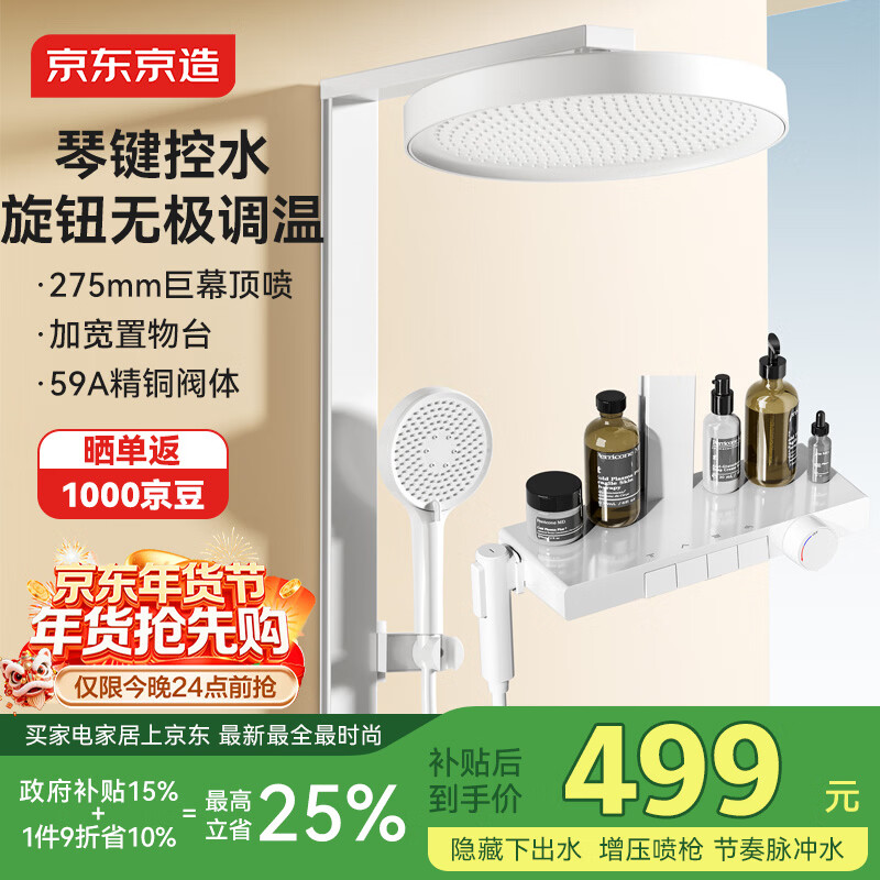 自营京东京造白月光淋浴花洒套装一体全铜奶油白大置物台方管喷枪
