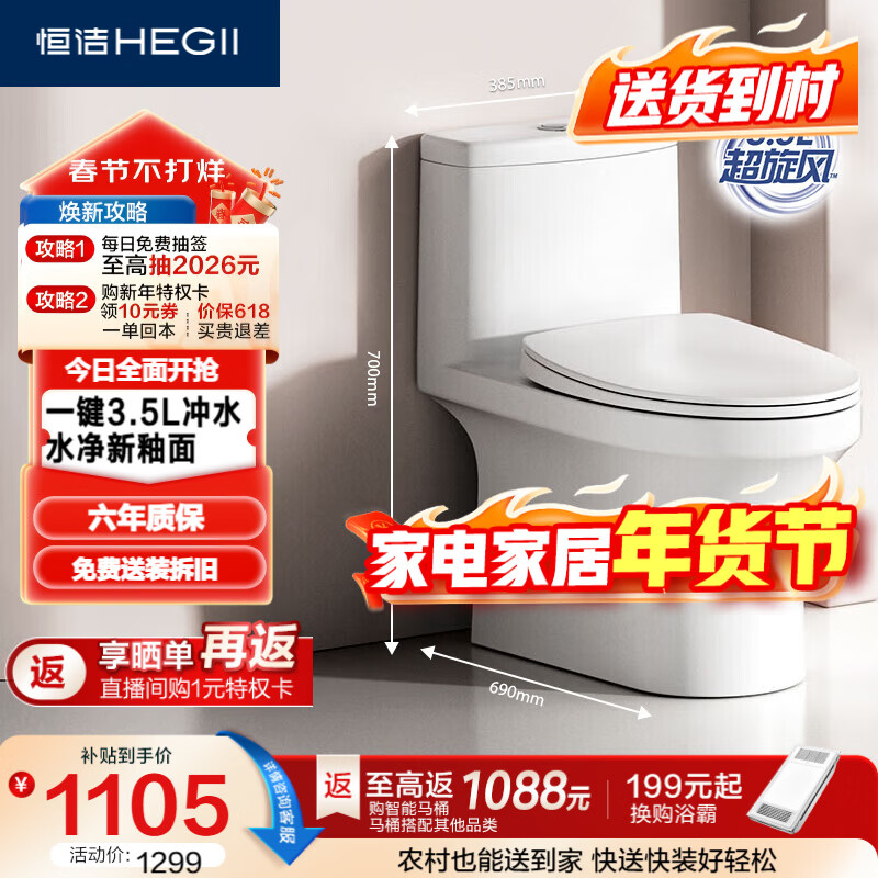 自营恒洁(HEGII)马桶561 超旋风大冲力虹吸式家用节水坐便器HC0561DT-A-305