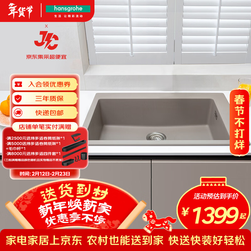 自营汉斯格雅(Hansgrohe)【顶奢款】厨房水槽石英石槽台上安装单槽含手动下水