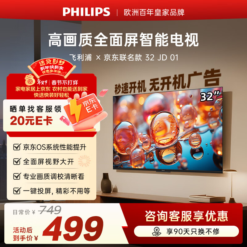 自营飞利浦(PHILIPS)经济款 京东联名款OS开机无广告电视32JD 01系列32英寸 高清全面屏二级能效电视机32PHF6590/T3