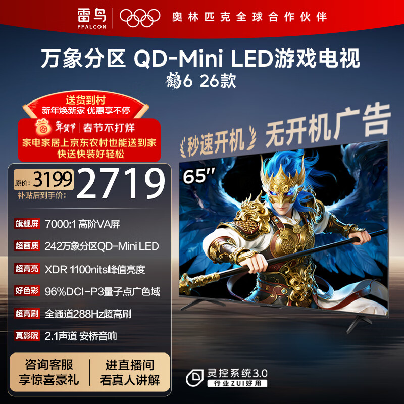 自营TCL雷鸟鹤6 26款 65英寸 万象分区QD-MiniLED1100nits 高阶VA安桥音响288Hz 平板游戏电视65R69A-A
