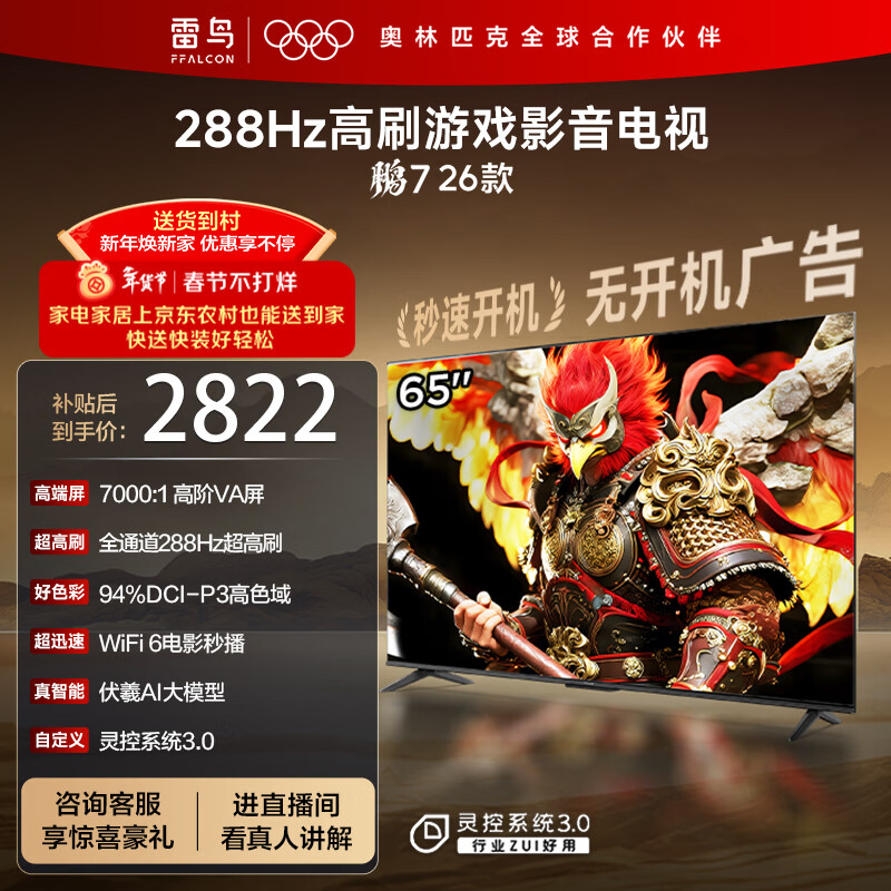 自营TCL雷鸟电视鹏7 26款 65英寸 高阶VA全通道288Hz HDMI2.1 94%P3色域 灵控系统 电视机 65S78A-A